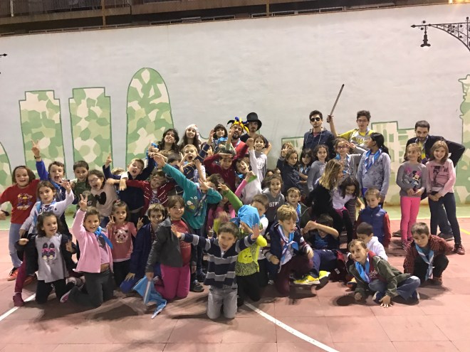 Tots aquests només som els grups d’Esquirols i Dofins! Els més petits vam fam fer uns jocs al principi per conèixer-nos una mica i després una gimcana per ajudar a una sèrie de personatges a recuperar les seves pertinences, ja que amb la seva màquina del temps se’ls havien barrejat alguns objectes que portaven i els havien perdut!