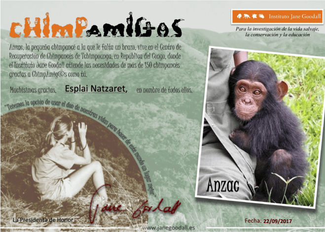 En total vam aconseguir 47 mòbils que ens van permetre l’apadrinament de l’Anzak, una ximpanzé rescatada que viu en el Centre de Rehabilitació de l’Institut Jane Goodall del Congo. Aquesta petita bebé ximpanzé, va patir primer la pèrdua de la seva mare, culpa de la caça furtiva, i després va perdre un braç. Va ser rescatada a Tchimpounga el 2012, i des d’aquell instant, el centre de rehabilitació s’ha encarregat de cuidar-la, alimentar-la, donar-li cures veterinàries i proporcionar-li un entorn psicològicament també acollidor i segur.