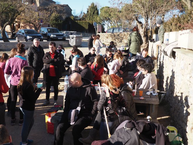 Com que vam arribar afamats, ens vàrem posar “Mans a la Barbacoa” i mentre enceniem les brases, alguns exmonitors van venir a celebrar el Nadal. Tot seguit, vam habilitar una taula perquè totes les famílies posessin la carn que havien portat per compartir. Hi havia de tot: cansalada, botifarres, xai, llom, pintxos, costelles, alguna carxofa, patates,… i fins i tot macarrons i cigrons pels vegetarians. I de postres no podien faltar uns exquisits torrons, neules i polvorons.