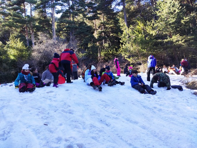 Després d’unes dues hores caminant, vam parar per dinar i semblava que havíem perdut l’esperança i que no podríem jugar amb la neu, però tot just acabats de dinar… NEU!!