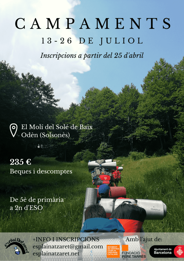 Els nois i noies de 5è de primària en amunt marxem de campaments al bell mig de la muntanya, per passar 14 fantàstics dies en tendes de campanya allunyats de la vida quotidiana de ciutat. En aquests dies, viurem mil aventures i ens endinsarem en la més remota Catalunya.