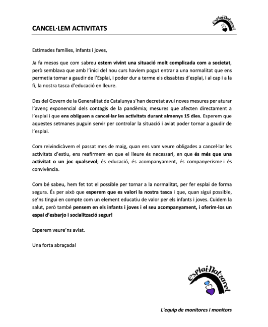 Malauradament, degut a les mesures decretades des del Govern de la Generalitat de Catalunya per aturar l’avenç exponencial dels contagis de la pandèmia, ens veiem obligats a cancel·lar les activitats durant almenys 15 dies.